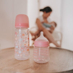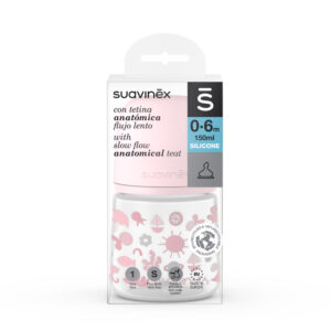 Biberón con Tetina Fisiológica Flujo lento con capacidad de 150 ml. La tetina imita en textura y consistencia el pezón materno y consigue que la lengua se mantenga en la misma posición natural que cuando el bebé mama del pecho. Flujo Lento (S): Deja pasar poca cantidad de líquido. indicada para los primeros días de vida, para las tomas de leche, glucosa o agua. Biberon con Tetina Fisiológica. Plana y simétrica: Es la forma más recomendada por Odontopediatras. Lo más cómodo para el bebé que coge él solo el biberón. Válvula Anticólico: Permite el equilibrio de presión entre exterior e interior de la botella. Base cóncava ligeramente abombada: Consigue que boca, lengua y músculos de la mandíbula se posicionen correctamente. Permite una mayor adaptabilidad, ya que un bebé recién nacido apoyará los labios en el centro de la base, mientras que un bebé de más edad con la boca más grande podrá colocar los labios casi en el borde exterior cogiendo la totalidad de la tetina dentro de la boca. Permite que la punta de la tetina llegue más o menos atrás del paladar, según el bebé vaya creciendo. Silicona fina ultra-suave con acabado arenado, imita en textura y consistencia el pezón materno, consiguiendo: Un movimiento super flexible. La adaptación máxima a la forma del paladar. Todos los productos Suavinex no contienen Bisphenol A.