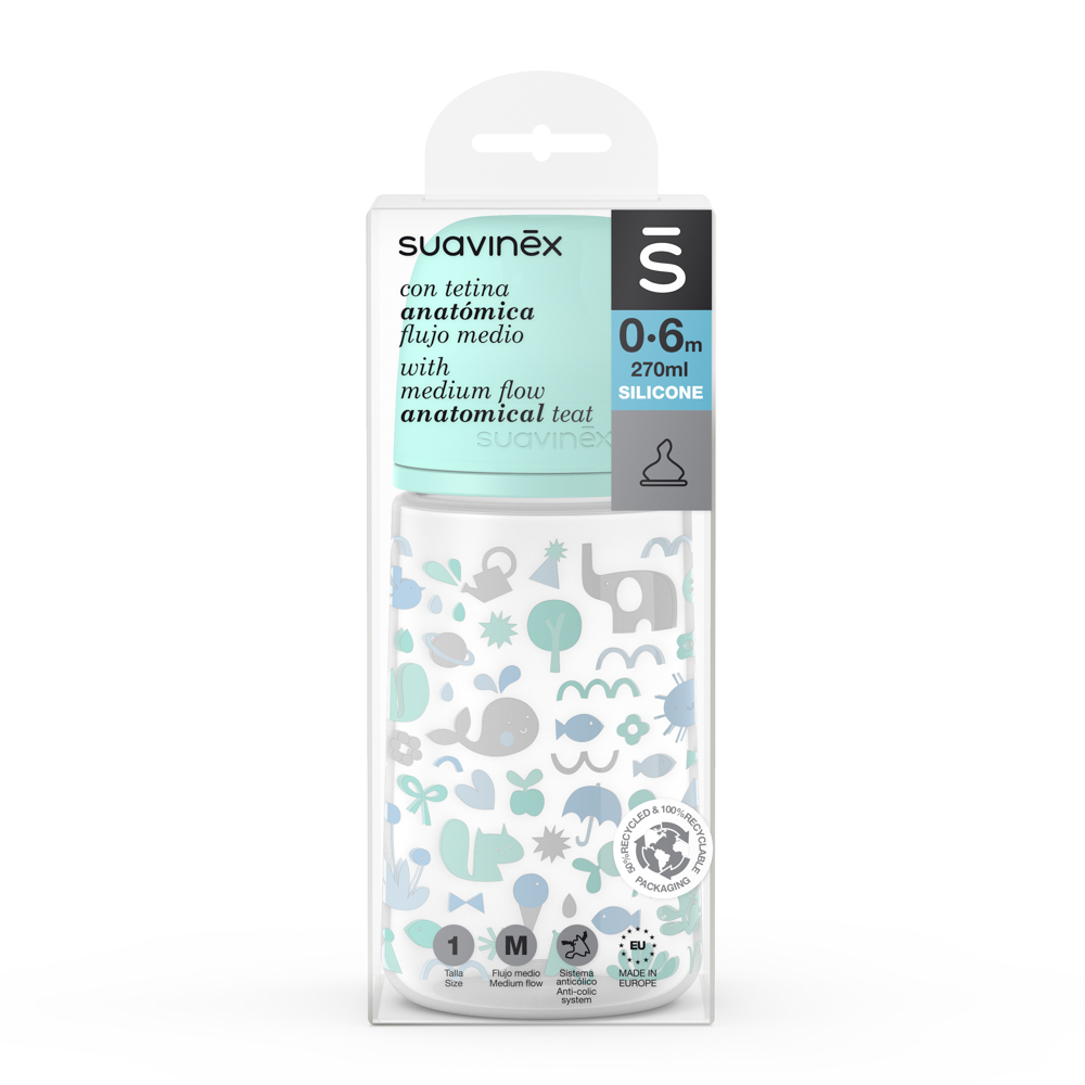Biberón con Tetina Anatómica SX Pro Flujo medio con capacidad de 270 ml. La tetina imita en textura y consistencia el pezón materno y consigue que la lengua se mantenga en la misma posición natural que cuando el bebé mama del pecho. Flujo Medio (M): deja pasar todo tipo de líquidos de densidad media. Ideal para leche, jugos o agua. Biberón con Tetina Fisiológica SX Pro, The Teat Revolution! Biberon Prints 270ml, nueva botella, forma recta que ofrece un agarre más cómodo para el bebé. Con tetina Fisiológica flujo medio, a partir de 3 meses, deja pasar todo tipo de líquidos de densidad media, ideal para leche, zumos o agua. El paso definitivo hacia una alimentación con biberón más natural, diseñada para respetar el desarrollo de la cavidad oral del bebé: La tetina Fisiológica SX Pro consigue que la lengua se mantenga en la misma posición fisiológica/natural que cuando el bebé mama del pecho. Creada teniendo en cuenta las particularidades bucodentales del bebé, cuyo maxilar y mandíbula están en pleno desarrollo. Cumpliendo con las recomendaciones profesionales más avanzadas para no interferir en el desarrollo de la cavidad oral. Avalada por la Sociedad Española de Odontopediatría.