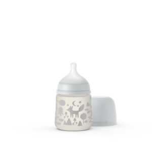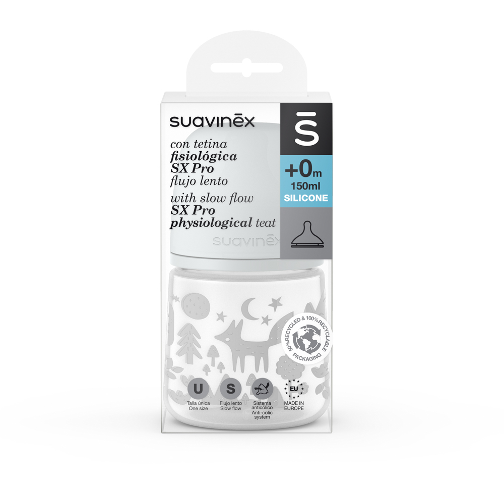 Biberón con Tetina Fisiológica SX Pro Flujo lento con capacidad de 150 ml. La tetina imita en textura y consistencia el pezón materno y consigue que la lengua se mantenga en la misma posición natural que cuando el bebé mama del pecho. Flujo Lento (S): Deja pasar poca cantidad de líquido. indicada para los primeros días de vida, para las tomas de leche, glucosa o agua. Diseñada para respetar el desarrollo de la cavidad oral del bebé. Creada teniendo en cuenta las particularidades bucodentales del bebé, cuyo maxilar y mandíbula están en pleno desarrollo.Cumpliendo con las recomendaciones profesionales más avanzadas para no interferir en el desarrollo de la cavidad oral.Avalada por la Sociedad Española de Odontopediatría.Forma Fisiológica, plana y simétrica: Es la forma más recomendada por Odontopediatras.Deja a la lengua más espacio en la cavidad bucal para que la succión sea lo más natural posible. Cuello más largo: Llega a la unión del paladar duro con el paladar blando, tal y como recomiendan estudios científicos para lograr una succión más natural. Cuello centrado respecto a la base .Lo más cómodo para el bebé que coge él solo el biberón.Válvula Anticólico: Permite el equilibrio de presión entre exterior e interior de la botella.Base cóncava ligeramente abombada: Consigue que boca, lengua y músculos de la mandíbula se posicionen correctamente.Permite una mayor adaptabilidad, podrá colocar los labios casi en el borde exterior cogiendo la totalidad de la tetina dentro de la boca.Permite que la punta de la tetina llegue más o menos atrás del paladar, según el bebé vaya creciendo.Silicona fina ultra-suave con acabado arenado, imita en textura y consistencia el pezón materno, consiguiendo máxima calidez. Un movimiento super flexible. La adaptación máxima a la forma del paladar.Todos los productos Suavinex no contienen Bisphenol A.