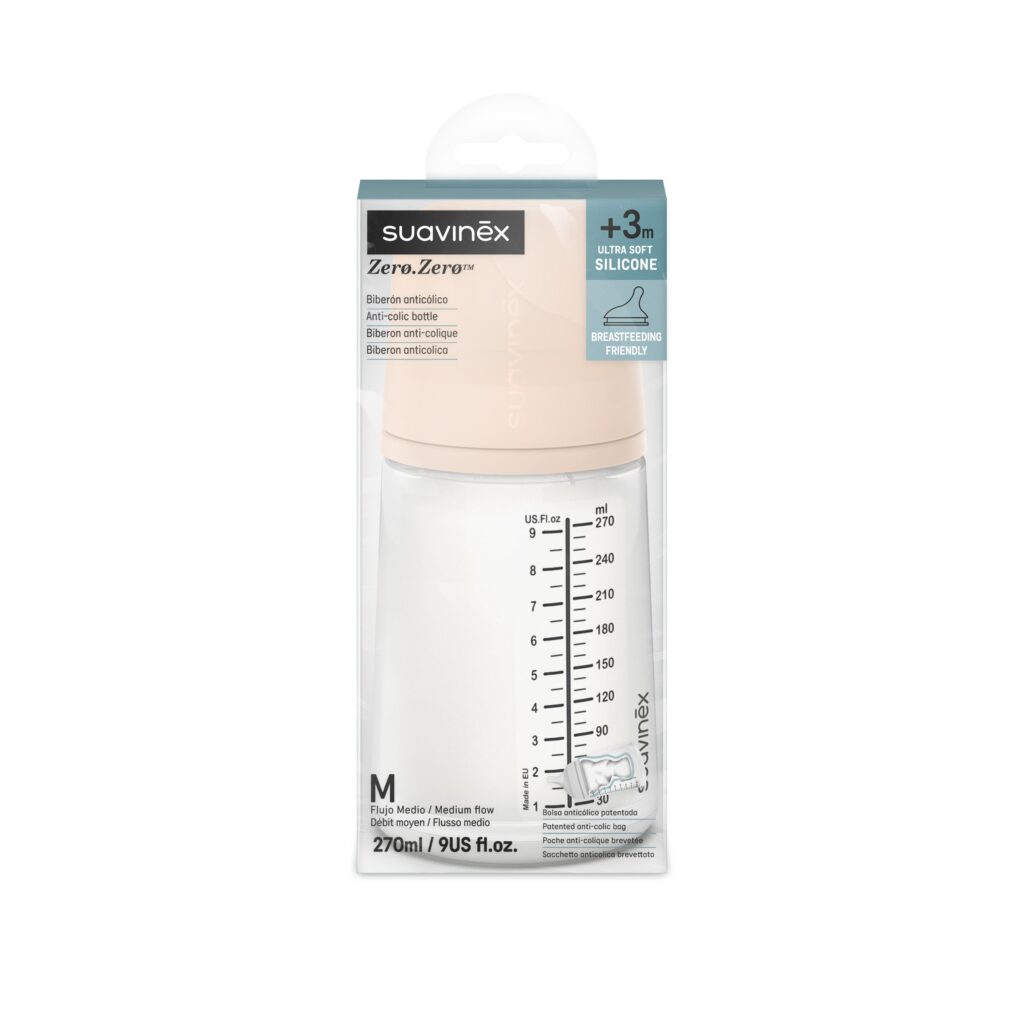 El biberón anticólico ZERO ZERO está indicado desde el nacimiento, incluso para bebés prematuros con fuerza de succión débil. Recomendado para poder combinar con la lactancia materna. Capacidad: 270 ml.