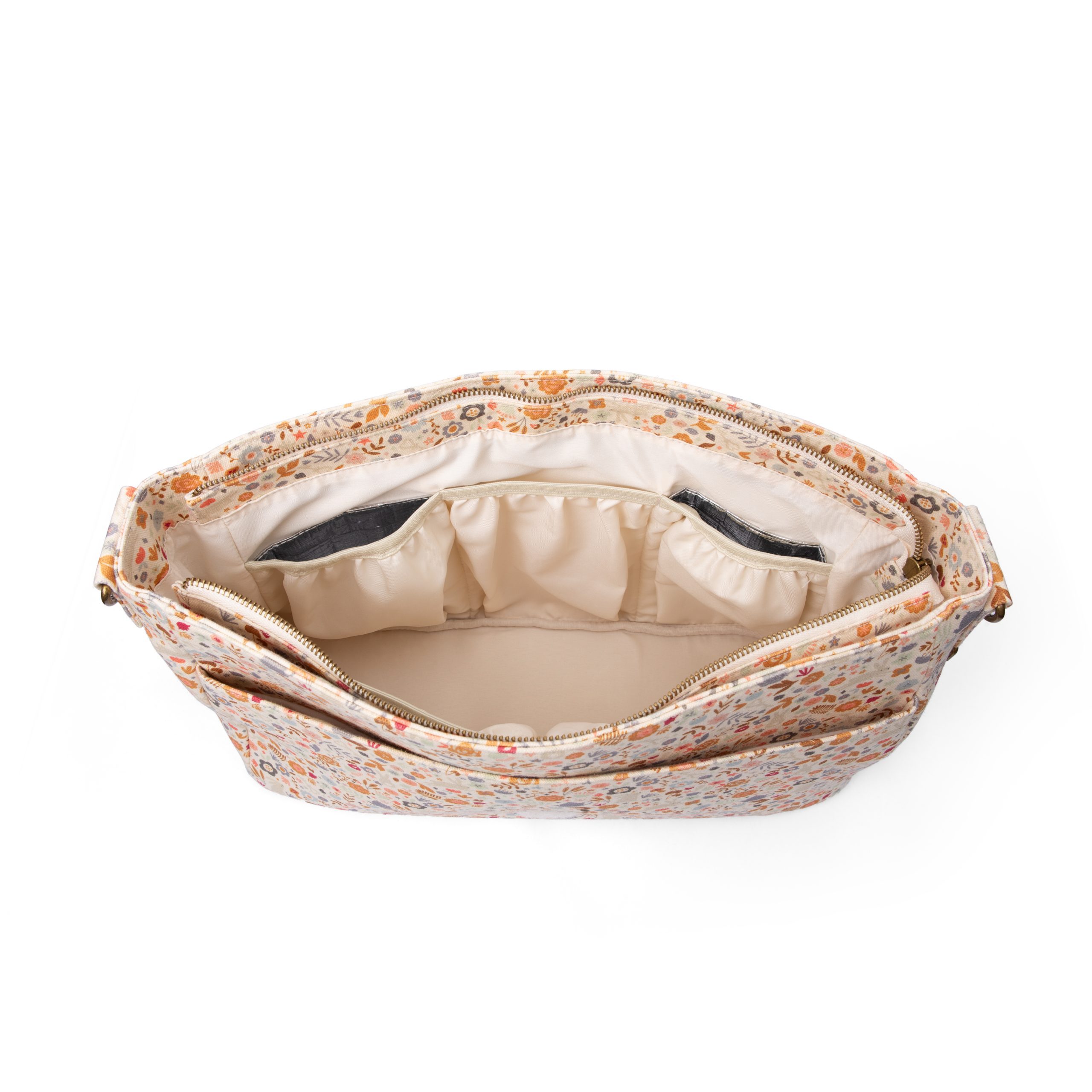 • MÚLTIPLES COMPARTIMENTOS. El bolso cuenta con 1 bolsillo exterior grande y 5 bolsillos interiores con goma: 3 bolsillos sencillos + 2 bolsillos térmicos, perfectos para transportar de pie el biberón, los papilleros o los tarritos sin que vuelquen.
