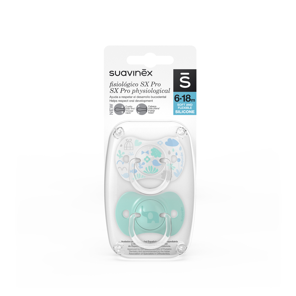 Chupones con tetina fisiológica SX Pro™, The Teat Revolution! Las Tetinas de Suavinex están avaladas por la Sociedad Española de Odontopediatría, SEOP y, aconsejadas por la Asociación de Especialistas Italianos en Ortodoncia, ASIO.