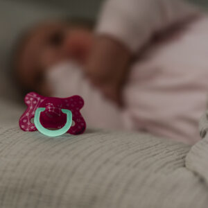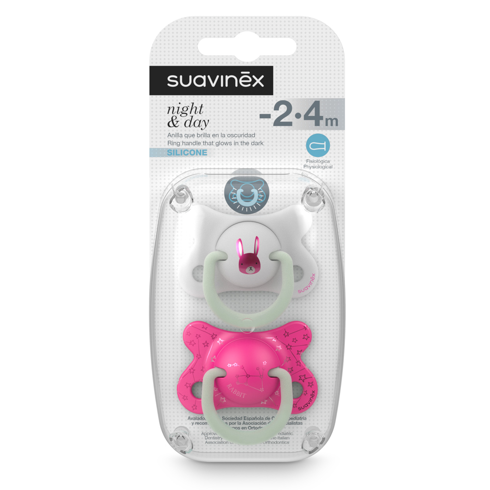 Se presentan en un pack de dos unidades, un chupón especial para el día y otro chupón para la noche. Ambos chupones disponen de la anilla luminiscente que brilla en la oscuridad para encontrar el chupete fácilmente en la cuna del bebé si se le cae.