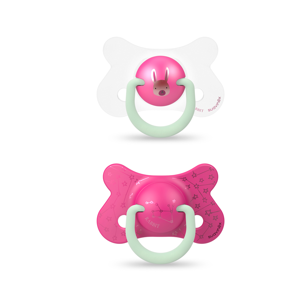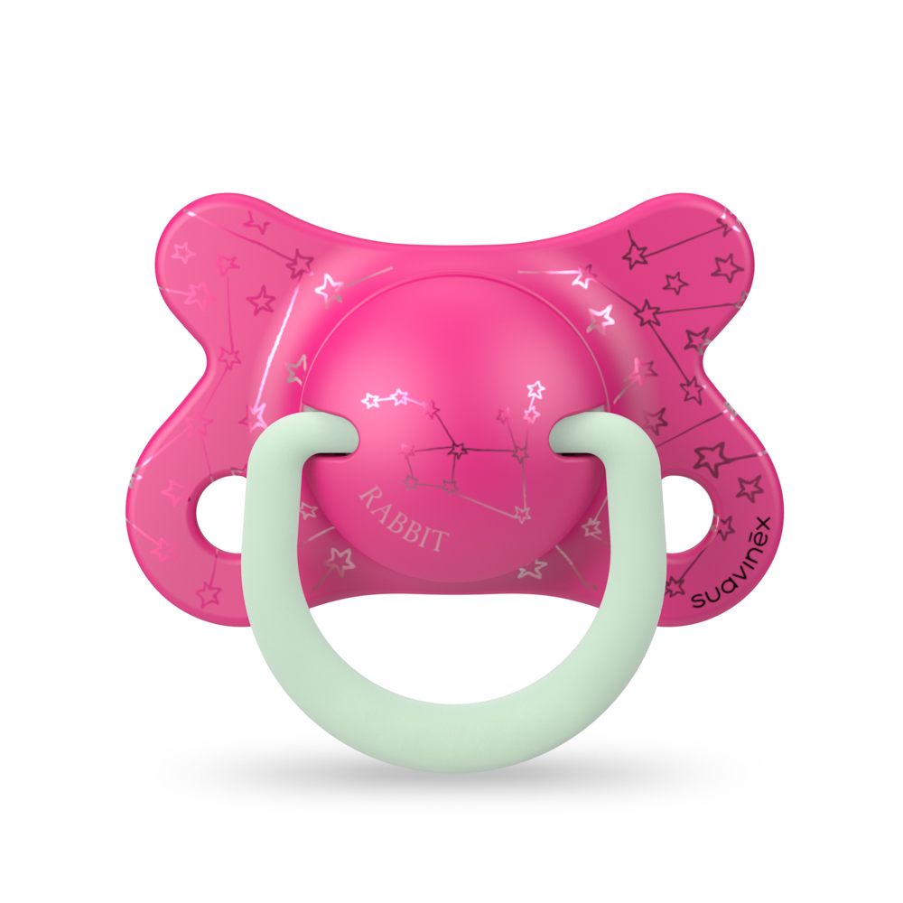 Chupones con tetina fisiológica y anillas luminiscentes que brillan en la oscuridad. Las Tetinas de Suavinex están avaladas por la Sociedad Española de Odontopediatría, SEOP y, aconsejadas por la Asociación de Especialistas Italianos en Ortodoncia, ASIO.