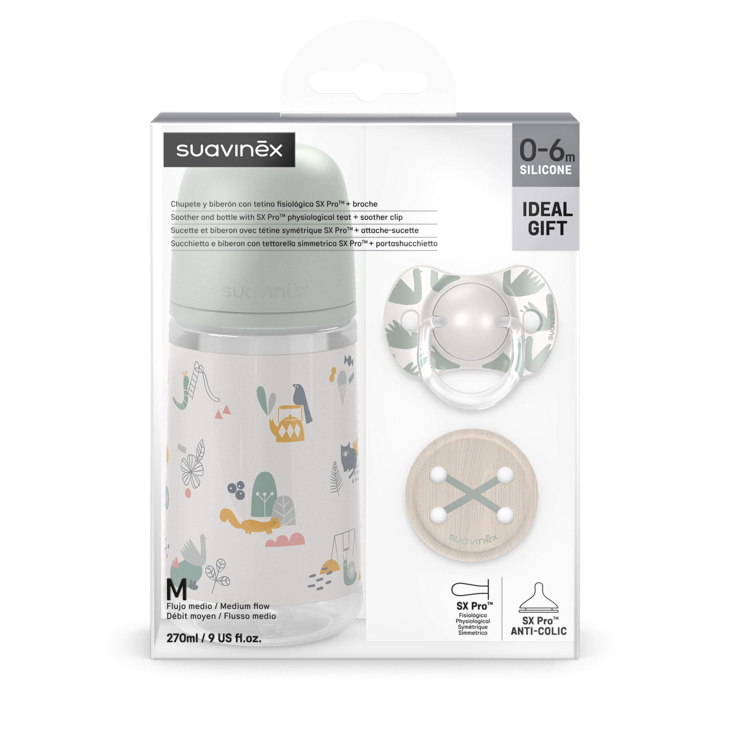 -Biberón de 270ml con tetina SX Pro de flujo medio. La tetina SX Pro es de silicona y cuenta con sistema anticólico. El flujo medio está recomendado para para todos los líquidos de densidad media y puede utilizarse con la leche, los zumos o el agua. La tetina SX Pro consigue que la lengua se mantenga en la misma posición natural que cuando el bebé mama del pecho.