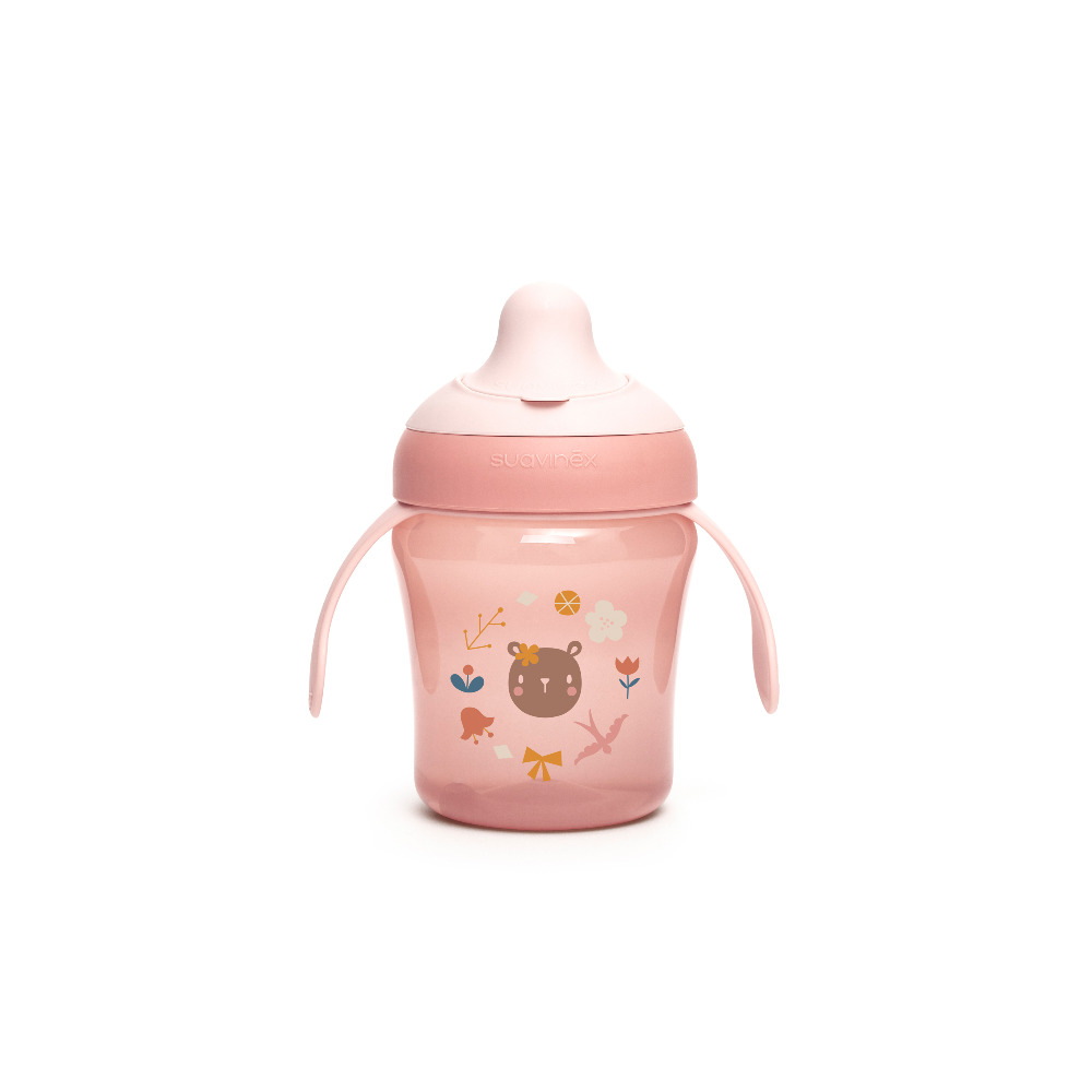 Biberón con asas antiderrame con boquilla de silicona para bebés a partir de 4 meses. Gracias a su boquilla de silicona suave y blandita, facilitaráel tránsito de tu bebé del biberón al vaso ya que el líquido solo sale cuando tu bebé succiona. Sus asas de quita y pon aportan independencia mientrasque su forma ergonómica está pensada para manitas pequeñas. Capacidad 150 ml.Todos los productos Suavinex no contienen Bisphenol A.